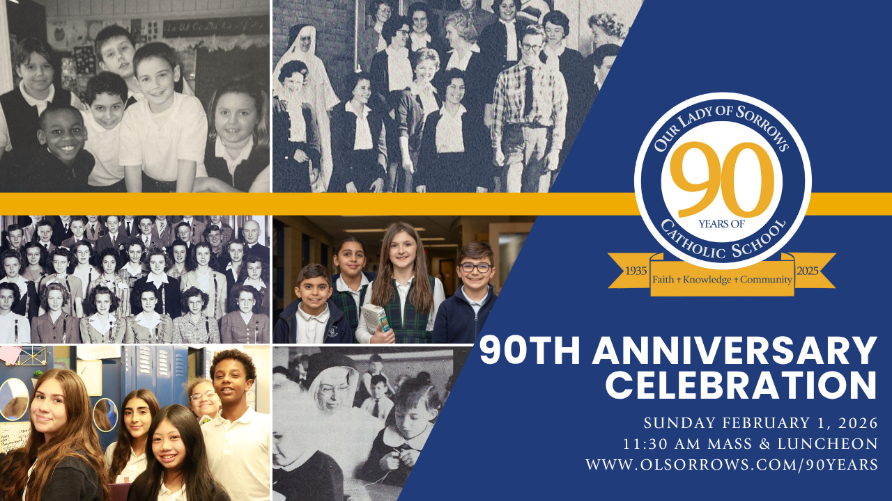 The honor of your presence is requested at the Our Lady of Sorrows Catholic School 90th Anniversary Celebration for Current Families, Alumni, Parents of Graduates, Former Staff and friends on Sunday, February 1, 2026. Click the button for more information: